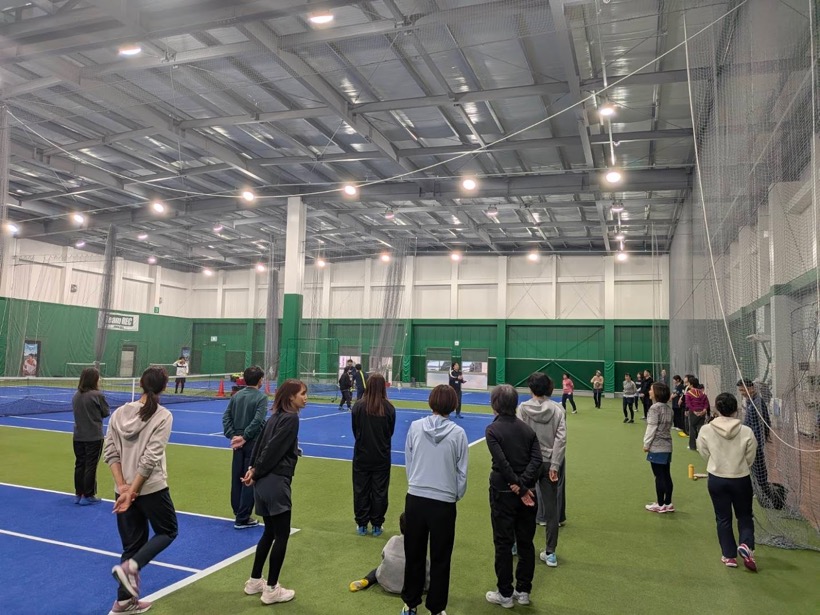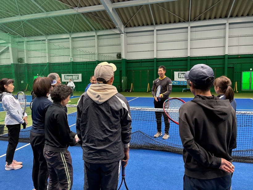 生憎の雨模様だったが、屋根のあるミニコートでレッスン実施。